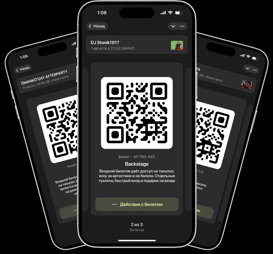 Мы заботимся о безопасности, поэтому все билеты, продающиеся через нашу платформу имеют динамический QR-код. Такой билет хранится прямо в приложении Flowerave App в Telegram во вкладке «Билеты», ее можно найти в нижнем меню